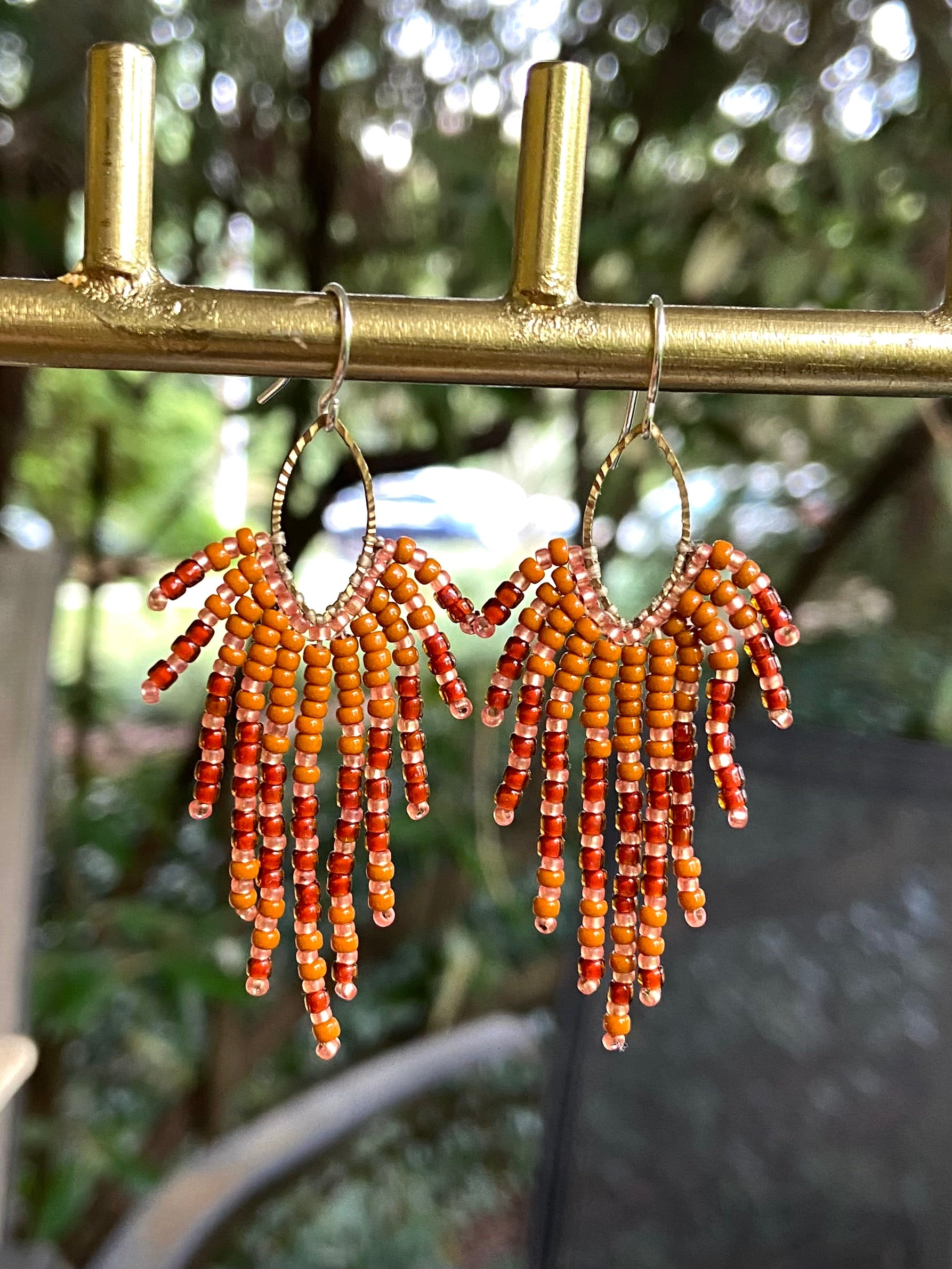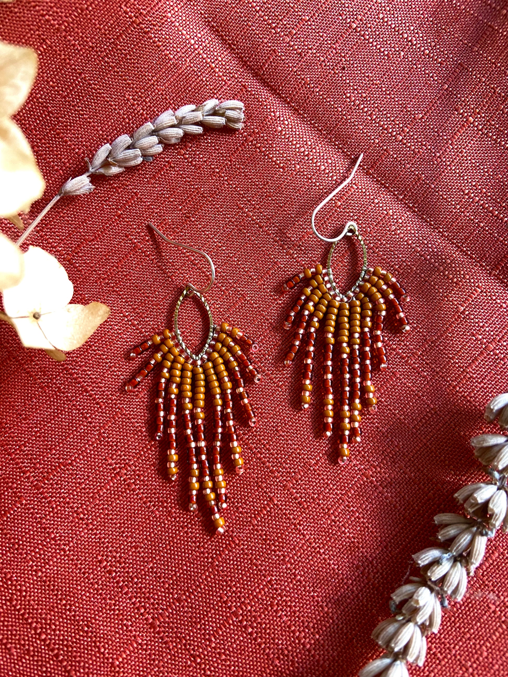 Small sized hand-beaded earrings on a textured marquise shape with matte and metallic high quality glass seed beads. The marquise shape is made of raw brass, not plated or treated. Ear-wires are solid sterling silver. All high quality and hand woven