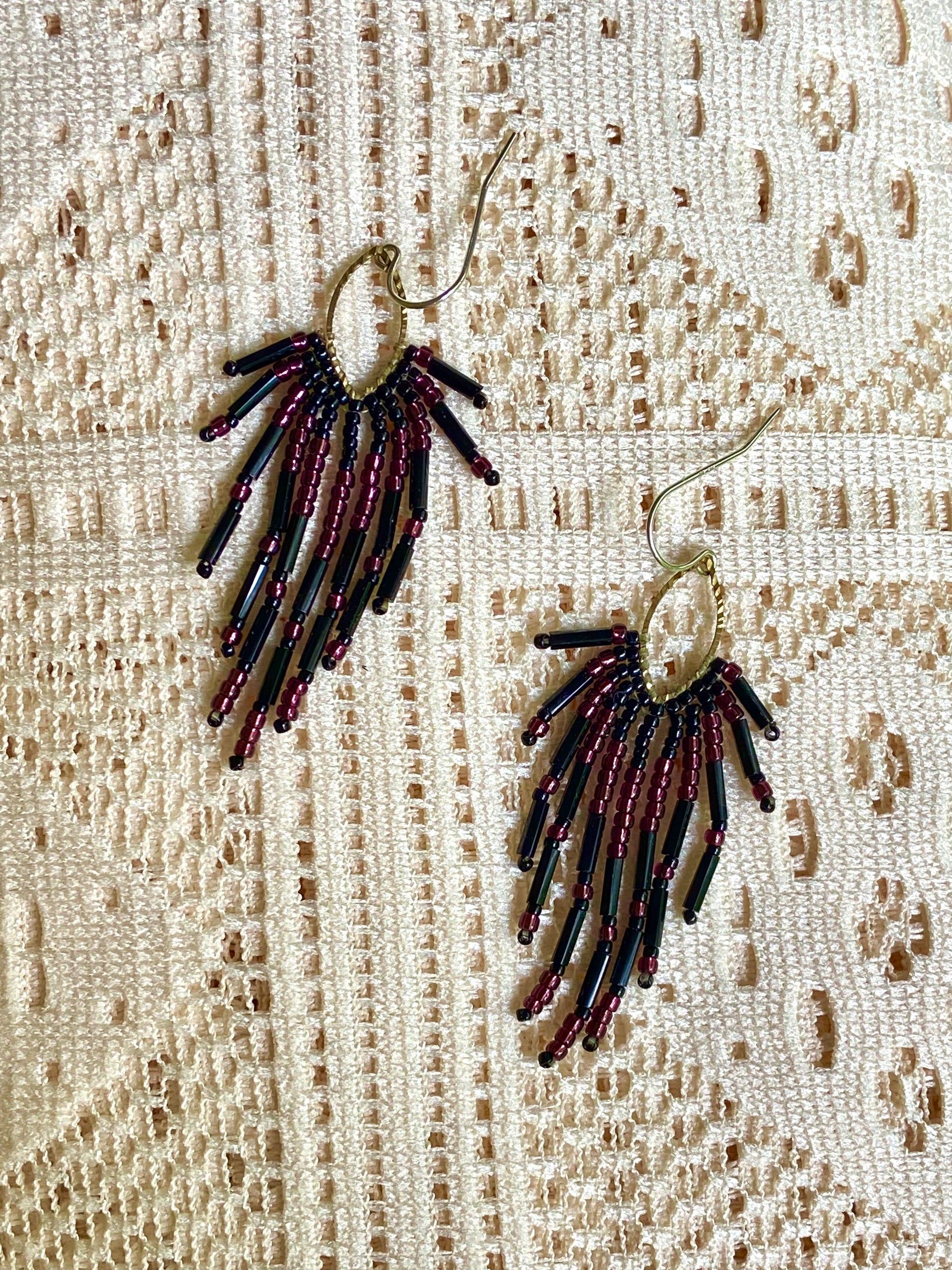 Small sized hand-beaded earrings on a textured marquise shape with matte and metallic high quality glass seed beads. The marquise shape is made of raw brass, not plated or treated. Ear-wires are solid sterling silver. All high quality and hand woven