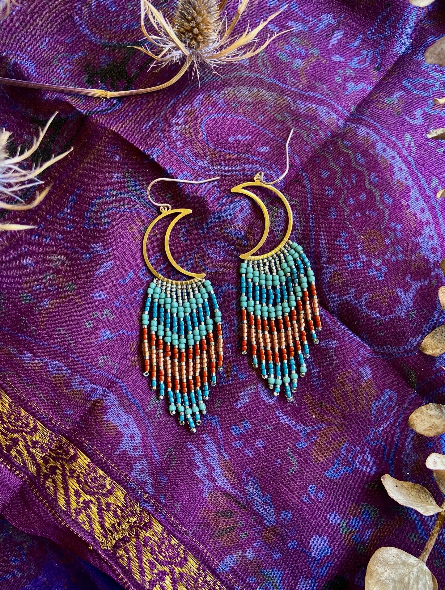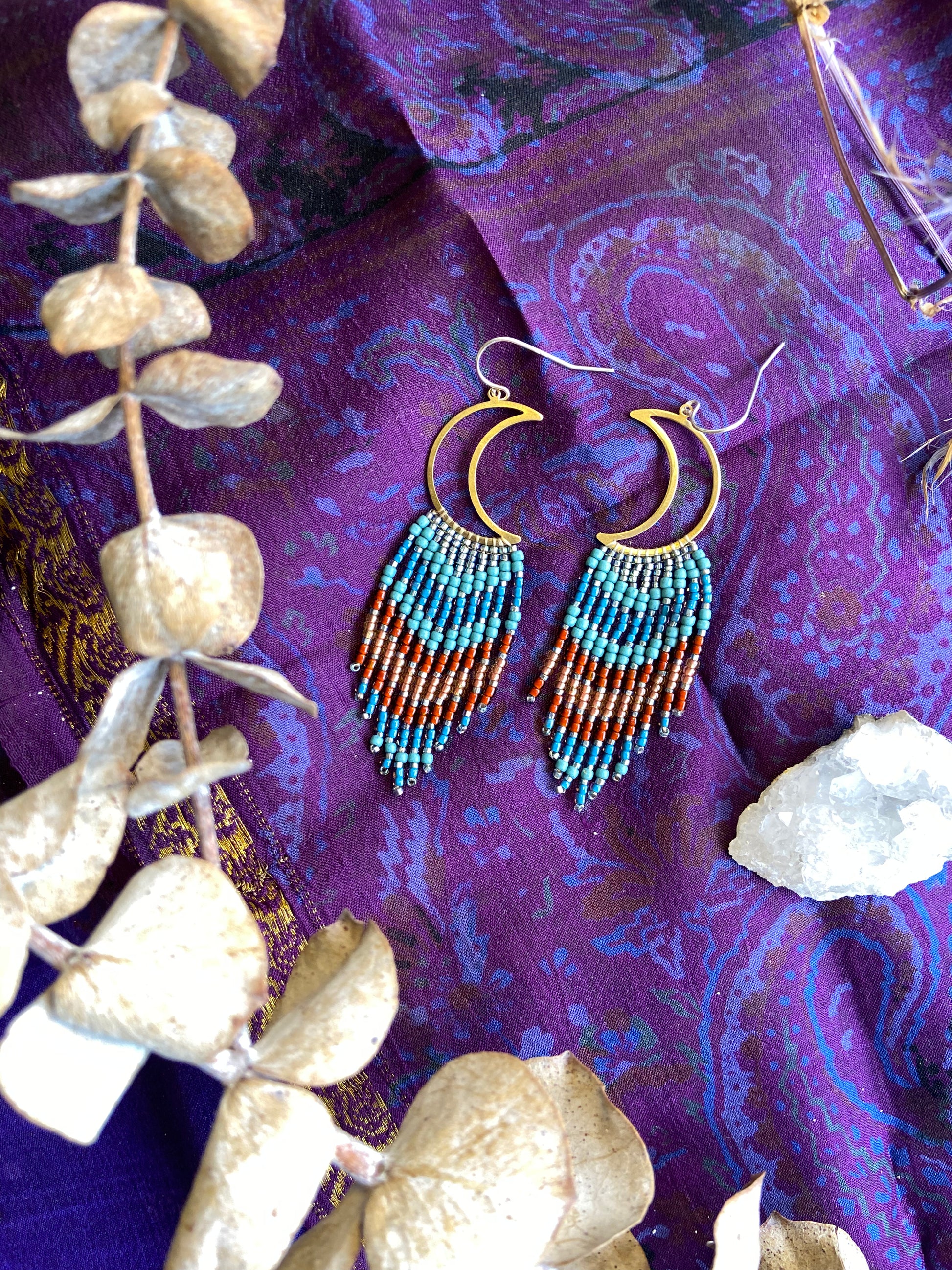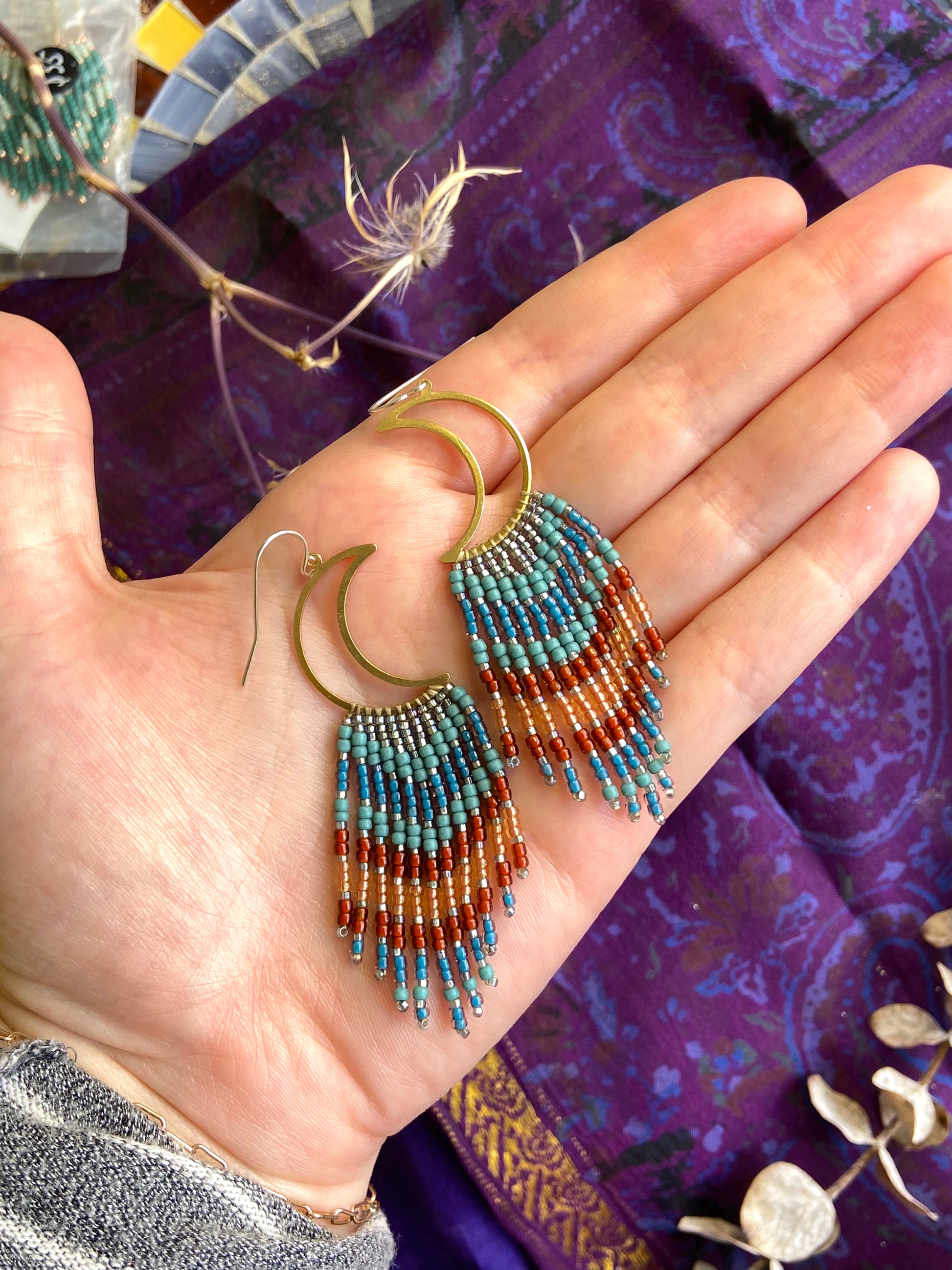 Hand beaded earrings featuring matte, shiny, and metallic high quality glass seed beads. The moon shape is made of raw brass, not plated or treated. Ear-wires are solid sterling silver. High quality and hand woven!