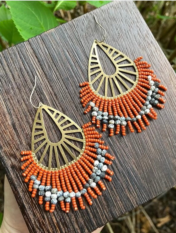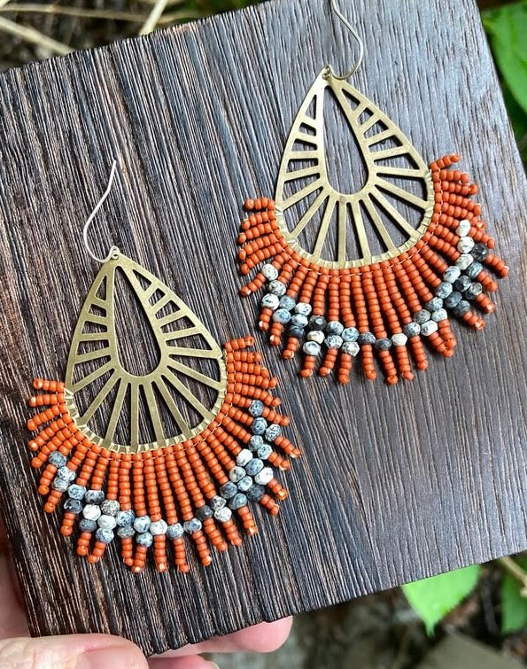 Funky Statement hand-beaded earrings on a segmented pear shape with color-change, matte, and genuine natural faceted dendritic opal. The pear shape is made of raw brass, not plated or treated. Ear-wires are solid sterling silver. All high quality and hand woven