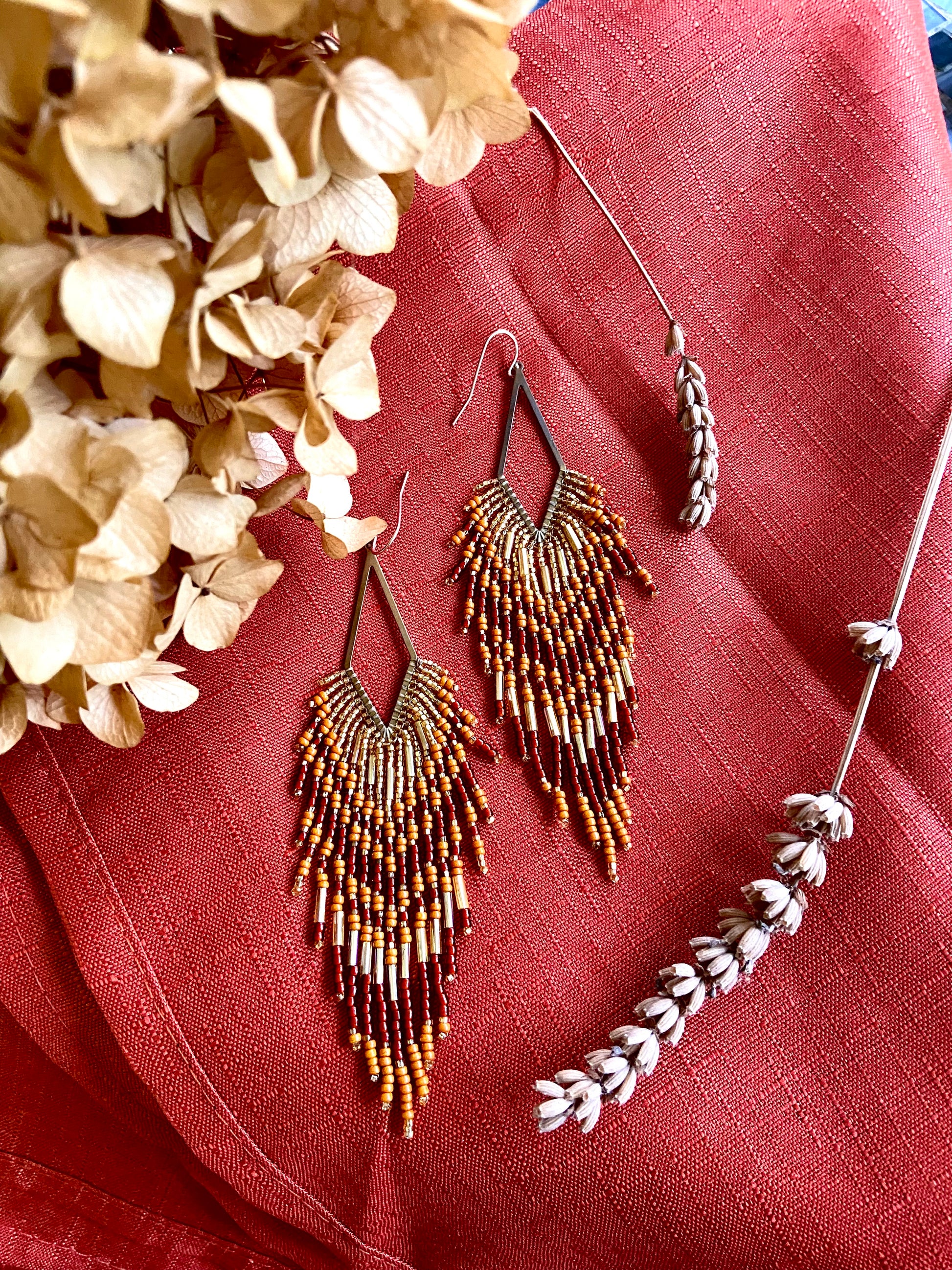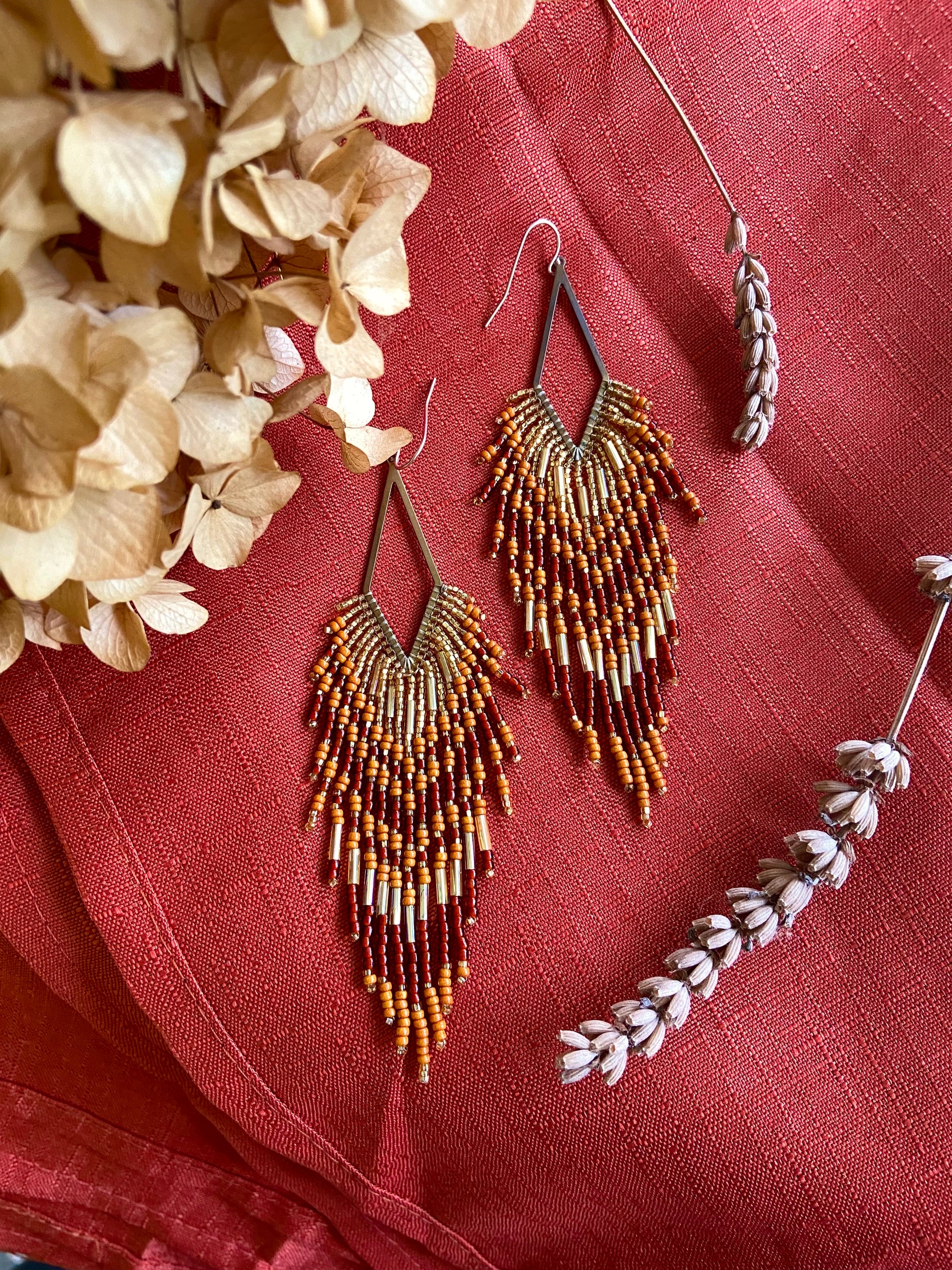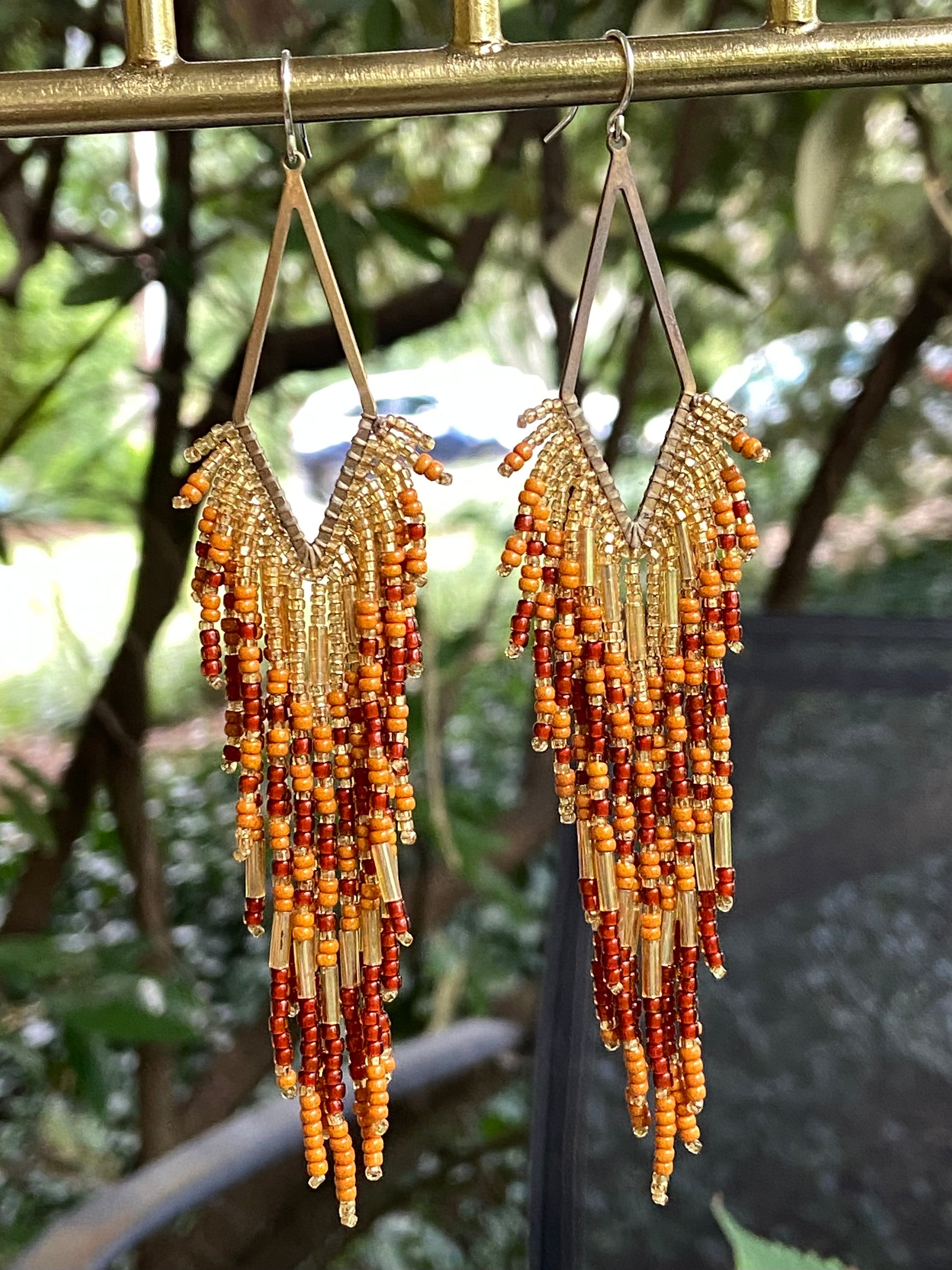 These rustic golden autumnal earrings give a feel like of a hike amoungst the fall leaves during golden hour. Long hand-beaded earrings on a Kite shape with matte, shiny, and metallic high quality glass seed beads. The Kite shape is made of raw brass, not plated or treated. Ear-wires are solid sterling silver. All high quality and hand woven