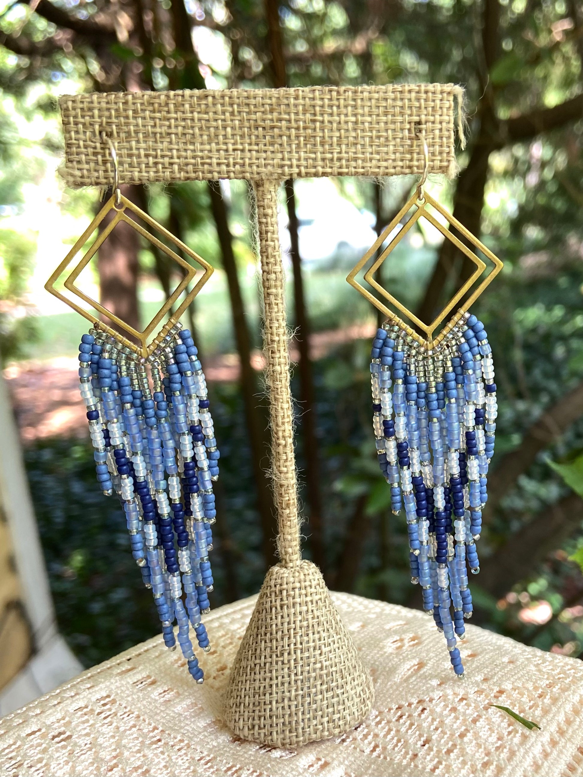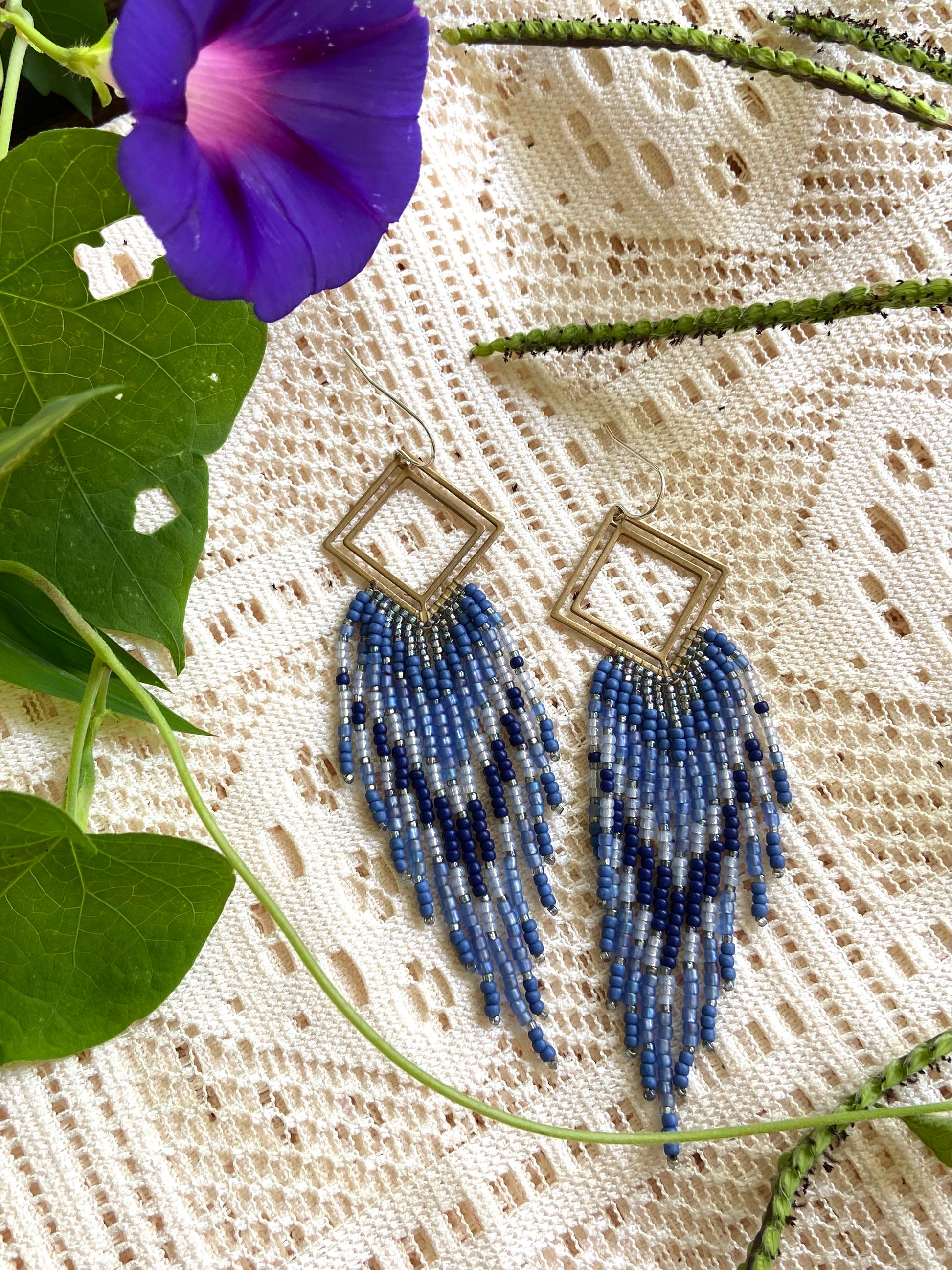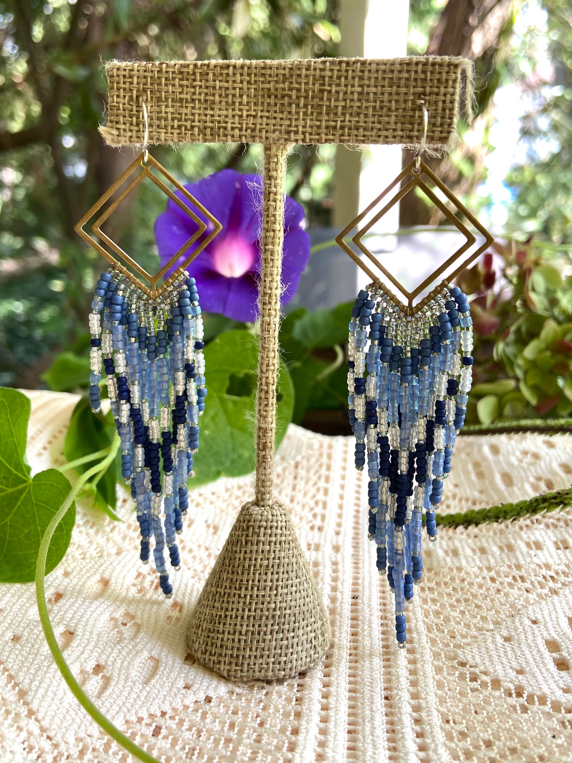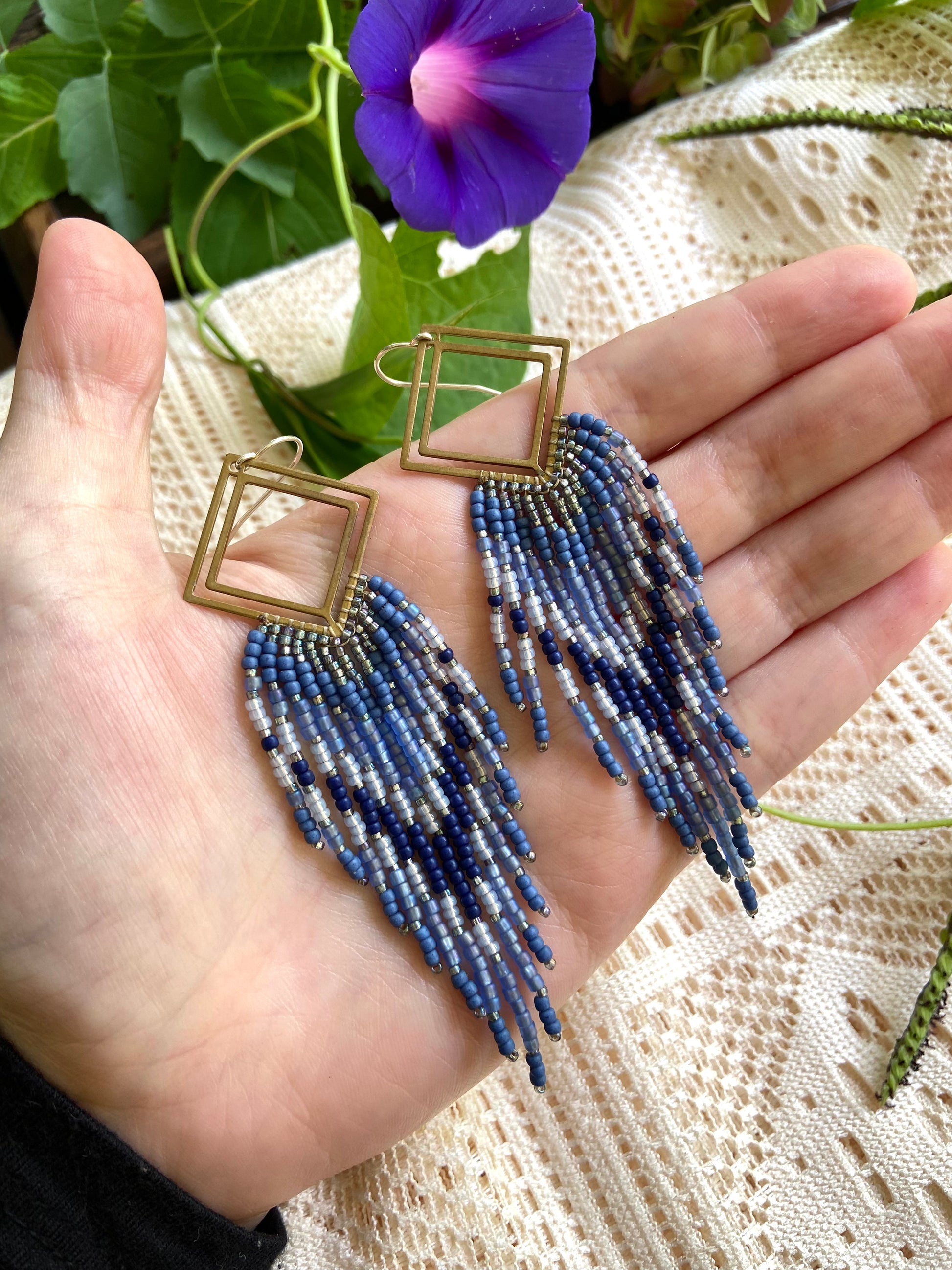 Long hand-beaded earrings on a square shape with matte, shiny, and metallic high quality glass seed beads. The Square shape is made of raw brass, not plated or treated. Ear-wires are solid sterling silver. All high quality and hand woven