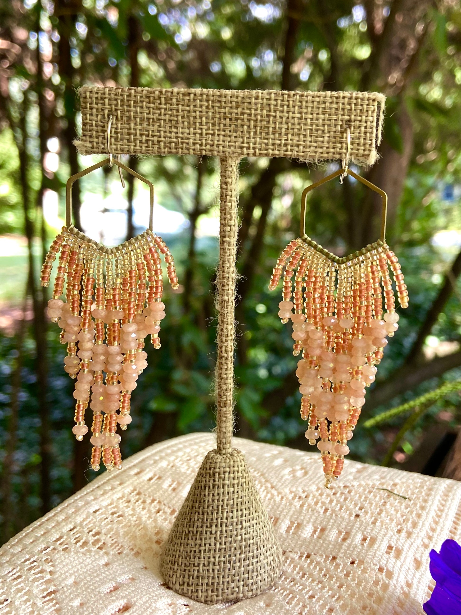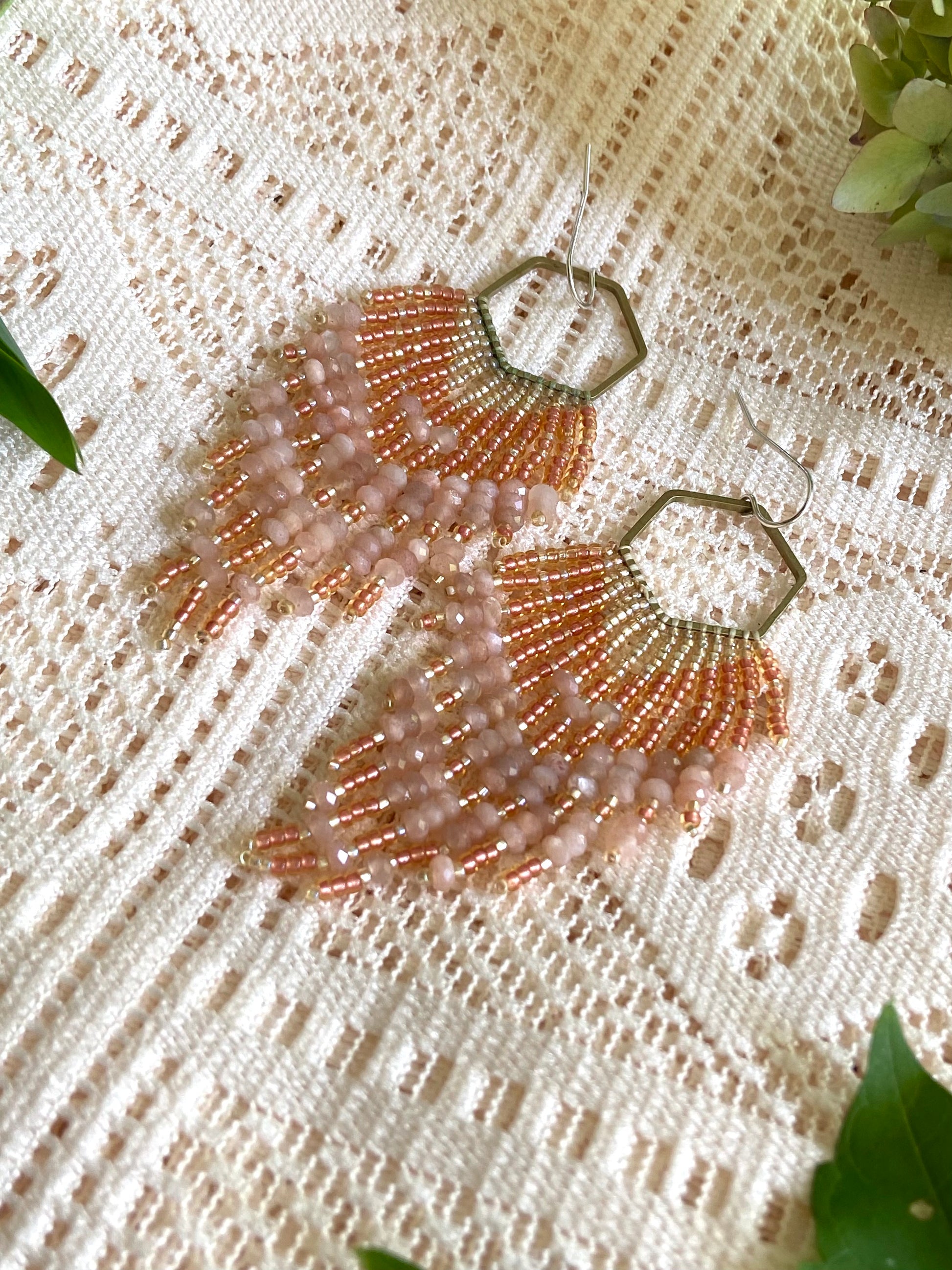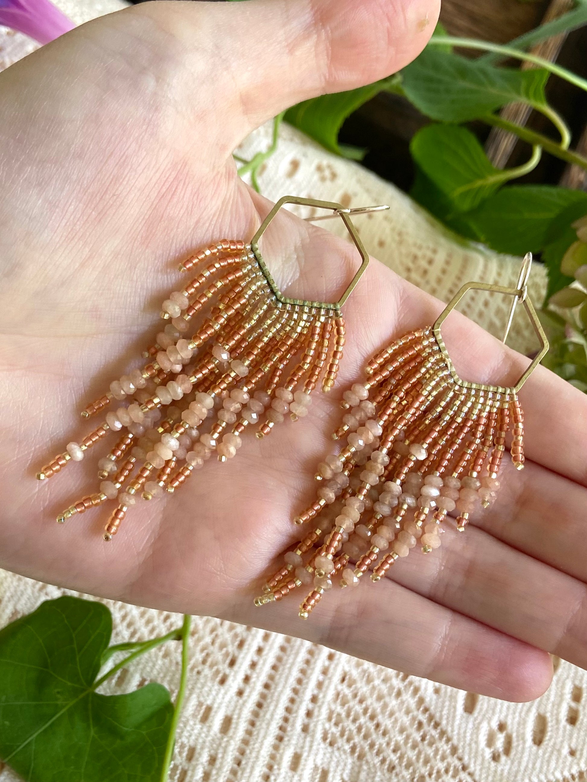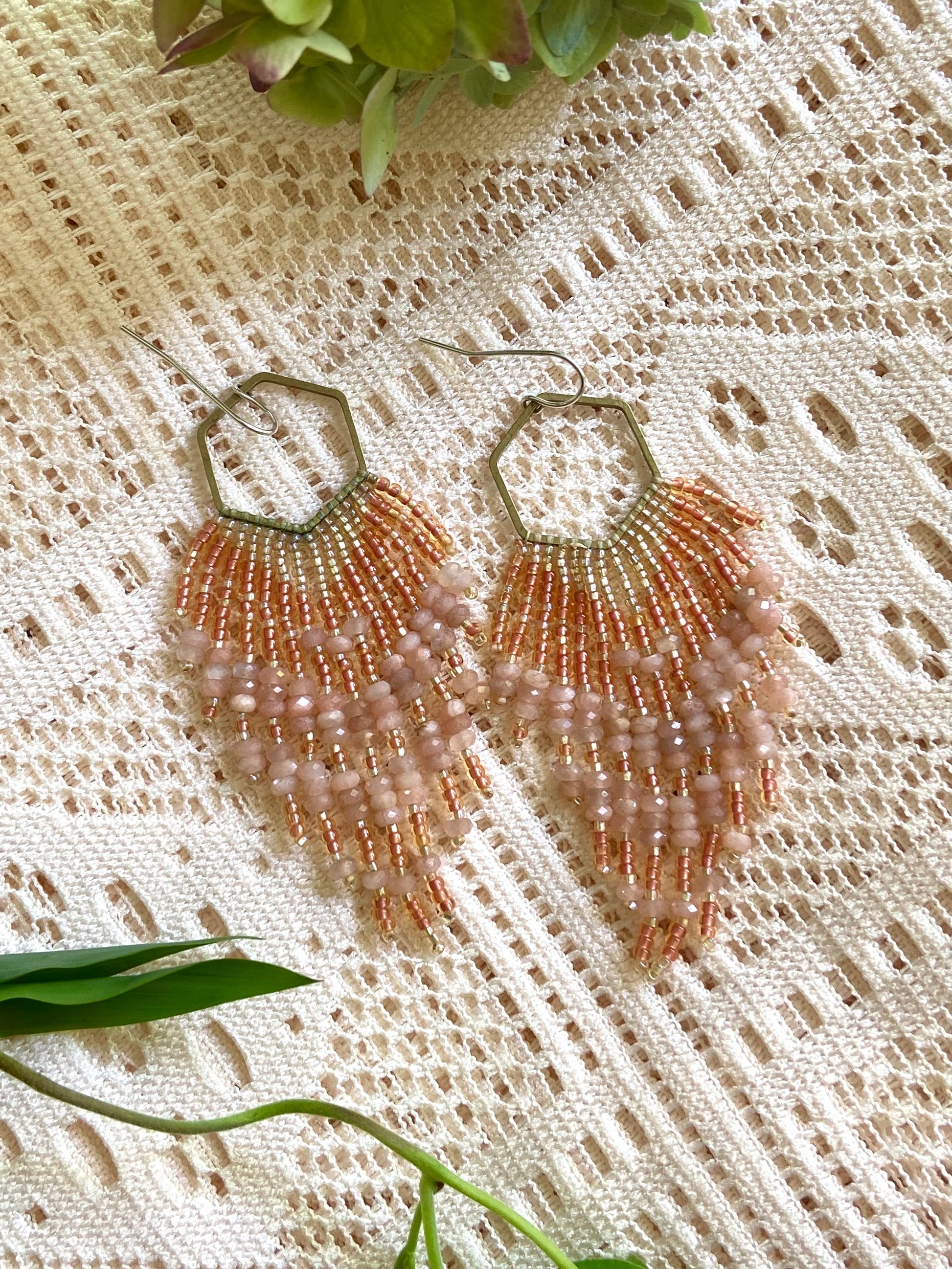 Long hand-beaded earrings on a Hexagon shape with shiny and metallic high quality glass seed beads and genuine faceted natural peach moonstone. The hexagon shape is made of raw brass, not plated or treated. Ear-wires are solid sterling silver. All high quality and hand woven